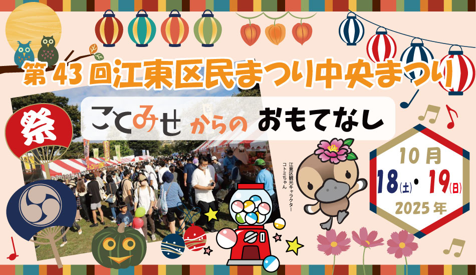 楽しいプログラムが満載の江東区内最大規模のイベント「第43回江東区民まつり中央まつり」が開催されます。ことみせの登録店が参加する「ことみせからのおもてなし」ブースにぜひお立ち寄りください!